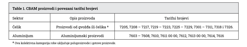 Tabela ispod prikazuje neke od proizvoda koji su trenutno obuhvaćeni CBAM režimom tokom prelaznog perioda (2023–2025), zajedno s njihovim tarifnim kodovima.
